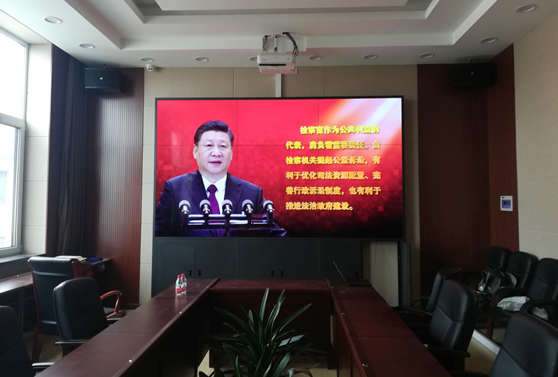 該案例中,維康國際為遼寧沈陽某檢察院提供一套會議大屏,采用3行3列,機(jī)柜式安裝安裝的55寸液晶拼接屏,超窄邊設(shè)計(jì),雙邊物理拼縫僅有0.88mm,有著很好的大屏畫面一體化顯示效果。