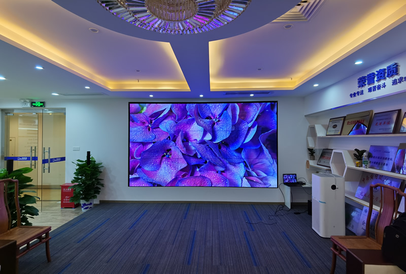 本案例中,維康國際為深圳羅湖某科技公司的展廳提供一套顯示大屏,采用3行3列拼接、55寸LG液晶拼接屏,超窄邊設計,大屏顯示清晰亮麗,物理拼縫僅有0.88mm,有著很好的畫面一體化顯示效果。