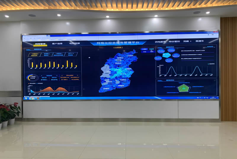 該案例,是維康國際為國家電網-太原河西營業(yè)廳安裝了一套大數據顯示屏系統(tǒng),這套系統(tǒng)主要由3x5/55寸0.88mm液晶拼接屏組成。我們可以從上圖看到,大屏畫面清晰亮麗,超小縫隙拼接,有著很好的視覺體驗效果。