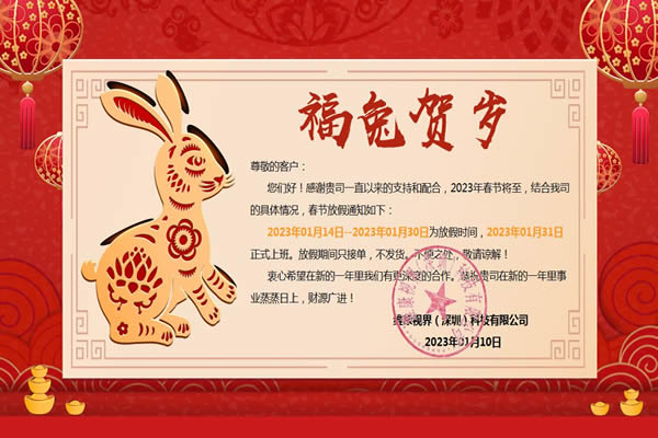 新年將至,預(yù)祝大家新年快樂!感覺大家一直以來的支持與認可。根據(jù)相關(guān)規(guī)定,結(jié)合我司經(jīng)營情況,2023年春節(jié)放假公告如下: