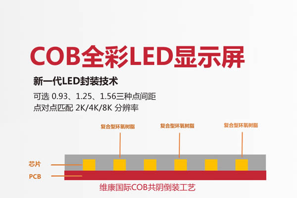 本產品采用 COB封裝技術,和傳統(tǒng)的 SMD 表貼式封裝不同,它是將發(fā)光芯片集成在 PCB 板中,而非一顆顆焊接于 PCB。該技術有效提升了 LED顯示屏可靠性、發(fā)光光色,防護性能等。