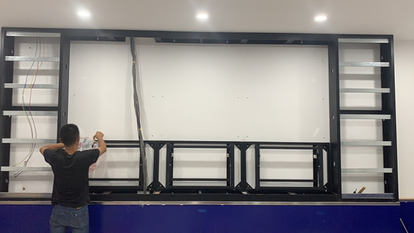 后維護方式指的是在拼接屏的后側(cè)進行維護,需要在屏幕背面留出足夠的維修通道,正常情況下約預留60公分以上的寬度,對施工空間的要求較高,而且會在一定程度上壓縮可視空間,這一般適用在空間較大的安裝環(huán)境。