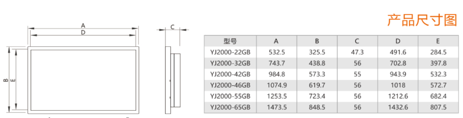 壁掛式設(shè)計,尺寸為22寸~65寸,分為圓角款和直角款,并可采用橫掛和豎掛兩種安裝方式;