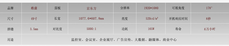 京東方49寸拼接屏是一款高性價比的工業(yè)顯示屏,拼縫規(guī)格是3.5mm,長寬尺寸為1078*608mm,也是京東方產品線中主要的一款,多用在視頻監(jiān)控與會議顯示中。