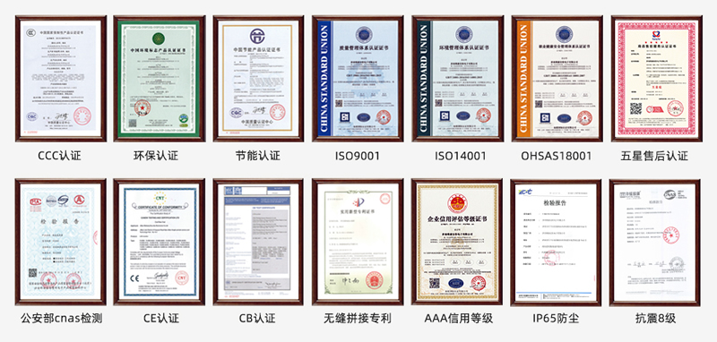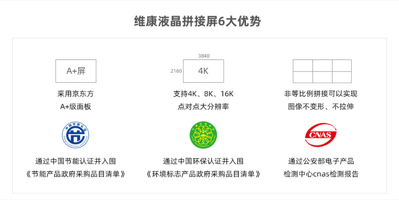 維康國際通過了ISO9001質量管理體系、ISO14001、OHSAS18001、3C、節(jié)能認證、環(huán)保認證、公安部cnas檢測報告、抗震8級、防塵、CE、CB、FCC、ROHS、外觀專利、大屏軟件專利等,在支持客戶參與招投標項目中有很大優(yōu)勢。
