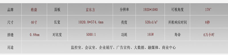 46寸拼接屏0.88mm拼縫的產(chǎn)品采用國產(chǎn)京東方面板組成,是目前除55寸以外另外一款可以做到0.88mm拼縫的產(chǎn)品,目前也只有京東方一款面板可選。