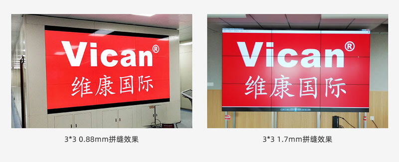 下圖是一組3*3的46寸拼接屏0.88mm與1.7mm液晶拼接屏的對比效果,二者大的區(qū)別就是拼縫上面,0.88mm的拼縫明顯更小,視覺效果更好。