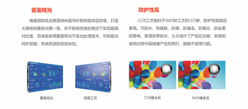 本產(chǎn)品采用 COB封裝技術(shù),和傳統(tǒng)的 SMD 表貼式封裝不同,它是將發(fā)光芯片集成在 PCB 板中,而非一顆顆焊接于 PCB。該技術(shù)有效提升了 LED顯示屏可靠性、發(fā)光光色,防護(hù)性能等。