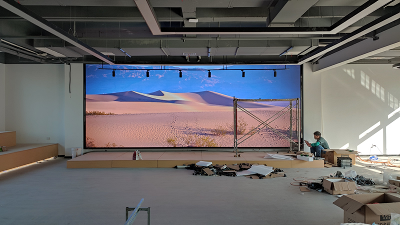 本案例中,維康國際為浙江臺州某企業(yè)展廳提供了一套顯示大屏,采用P2系列的LED全彩屏,大屏幕顯示清晰、色彩鮮艷、一體化效果好,如上圖所示。