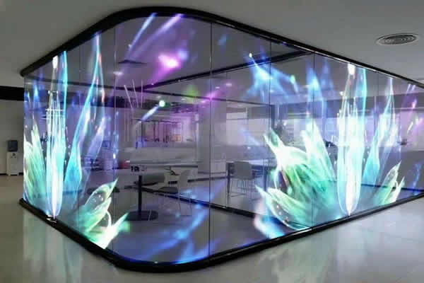 與LED透明屏完全不同,它是采用光學(xué)數(shù)字顯示技術(shù),對透明介質(zhì)材料進(jìn)行多層結(jié)構(gòu)調(diào)整,只會對激光光源方向的光進(jìn)行調(diào)控,對其他方向的光允許完全透過。從而實現(xiàn)全透明、高清晰的圖像顯示。當(dāng)然了,雖然透明顯示效果很好,但它的價格是比較貴的。